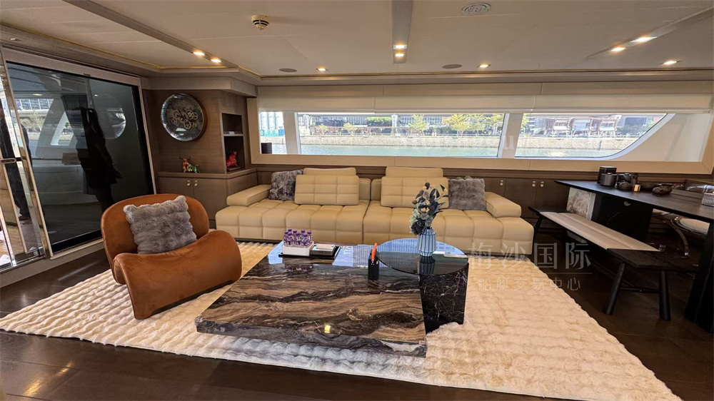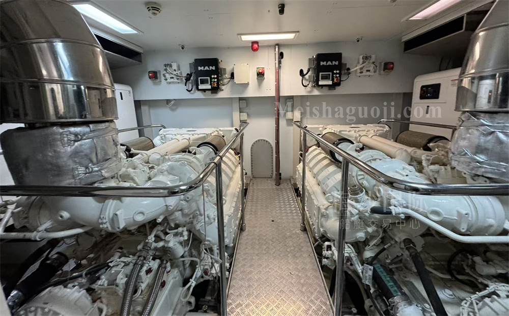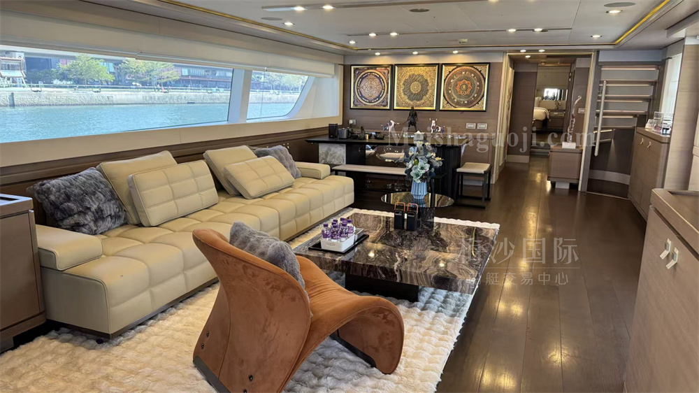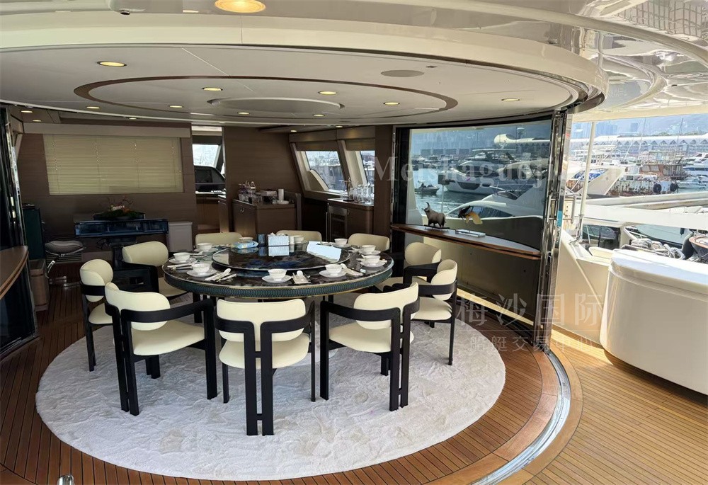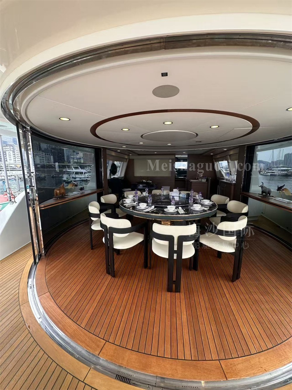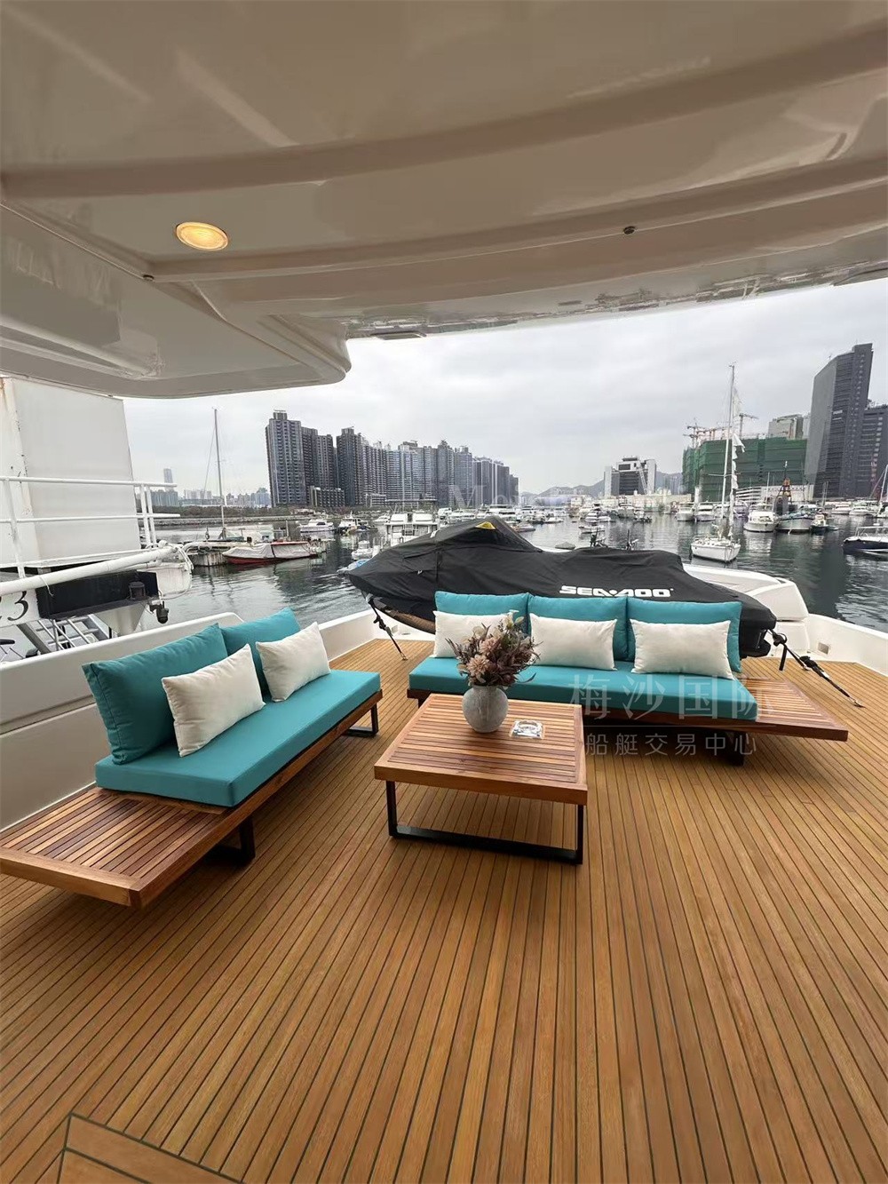 2015年产法拉帝CustomLine Navetta 33米超级游艇,长:33米,宽:7米,吃水:2.57米,两台MAN发动机共2800匹马力,使用600小时,燃油舱容:17000升,淡水舱容:3250升,五个房间六个洗手间,沙龙区空间十分宽敞,内部装修豪华,带超大会客厅和按摩浴缸